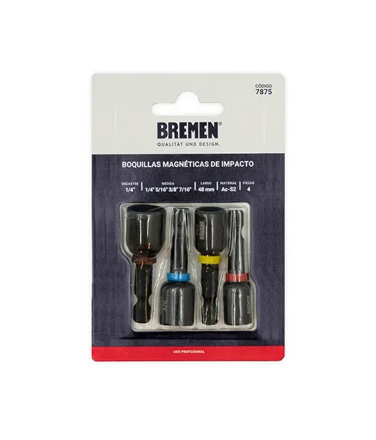 Las Boquillas Magnéticas de Impacto BREMEN® cuentan con un potente imán que permite un agarre seguro y son ideales para usar con atornillador de impacto, taladro o destornillador.