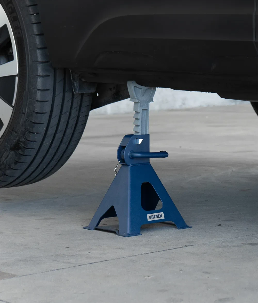 Los juegos de caballetes BREMEN, posee un sistema de bloque con persona pasante de seguridad. Posee una barra con cremalleras de 10 posiciones que permite tener el vehículo elevado a diferentes alturas de manera estable.