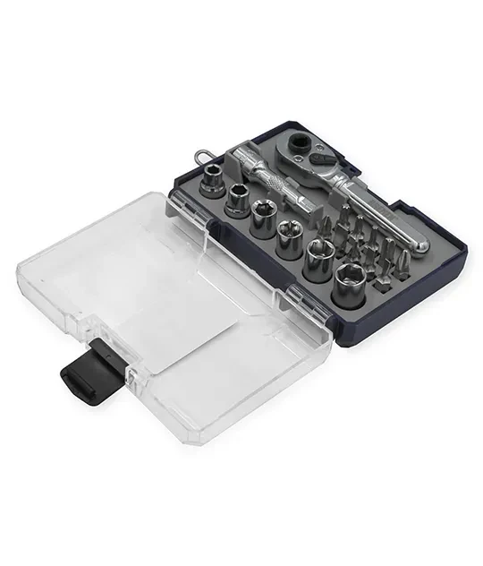 | Set de alta calidad con puntas de atornillar, llaves tubo y llave de crique para diferentes trabajos de atornillado y montajes pequeños de material Cr-V.