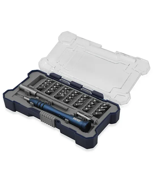 El Juego de Puntas de Precisión BREMEN® de 32 piezas es un producto completo, ideal para armar y desarmar rápidamente cualquier dispositivo. Además, cuenta con un robusto contenedor plástico que facilita el almacenamiento, transporte y acceso a todo el contenido de manera organizada.