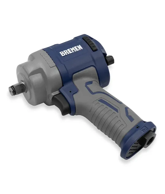 Llave de impacto neumática fabricada en composite de aluminio, material liviano, aislante térmico y acústico que proporciona mayor comodidad y resistencia. Posee un mango ergonómico de TPR que reduce considerablemente la transmisión de vibraciones a la mano del operario. Con torque regulable, compacta y versátil.