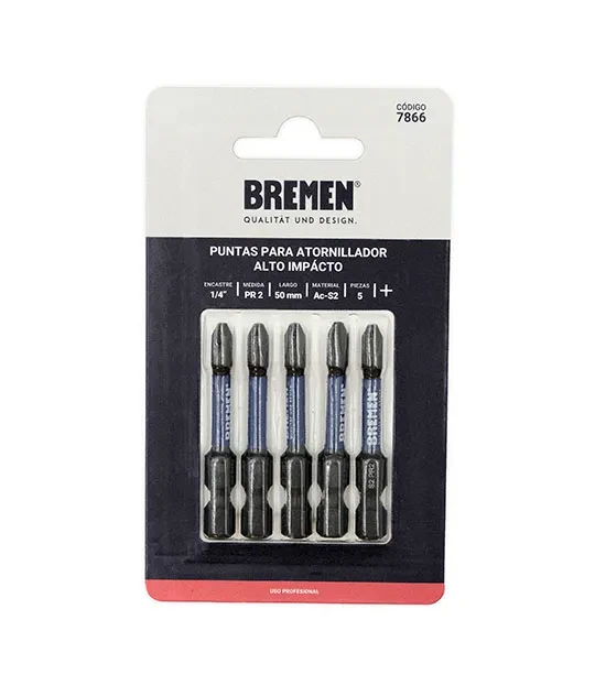 Las puntas de atornillador de alto impacto BREMEN esta diseñadas en material S2 lo que le otorga mayor resistencia y durabilidad.